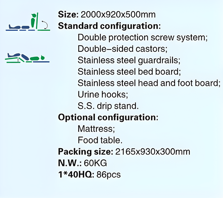 "2-crank bed for hospital , designed with a double protection screw system for safety, stainless steel guardrails for support, a bed board urine hook for convenience, and a stainless steel drip stand for medical equipment accessibility."